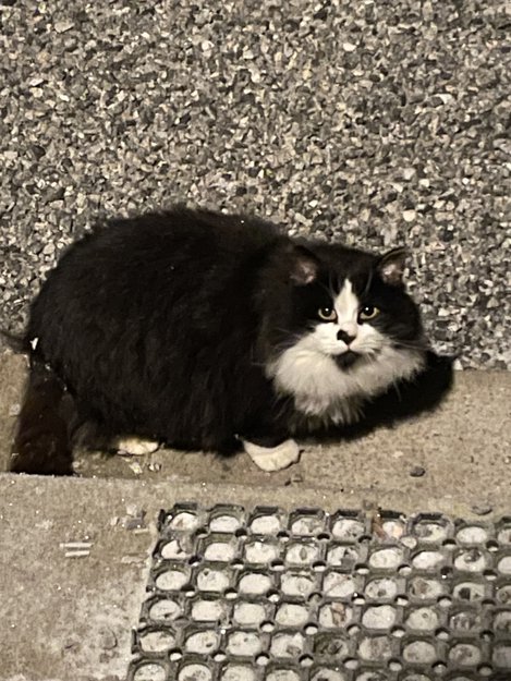 Stod plutselig på trappen og ville ha mat. Var så borte noen dager, men er nå tilbake. Det er veldig kaldt ute, men har selv mange katter og kan ikke ta den inn.