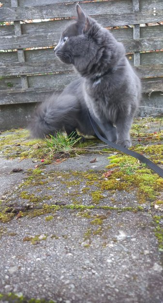 Grå med hvit flekk på halsen. Bustete hale. Sjenert og litt redd kattunge på 7 mnd