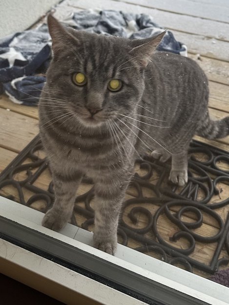 Denne store, fine, gråstripete pusen har er på min dør og vil inn.