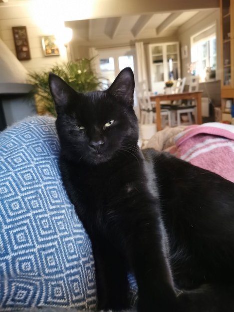 Vi skulle kastrere og chippe katten fem dager etterpå , men katten kom ikke hjem igjen 27.10.23 . Katten hadde kattedør. Helt svart hannkatt.Tre uker før dette skjedde hadde katten hatt verkebyll som ble til stort sår på høyre side av katten og den måtte behandles hos dyrlege . Dette var grodd men dette er også et kjennetegn på katten .