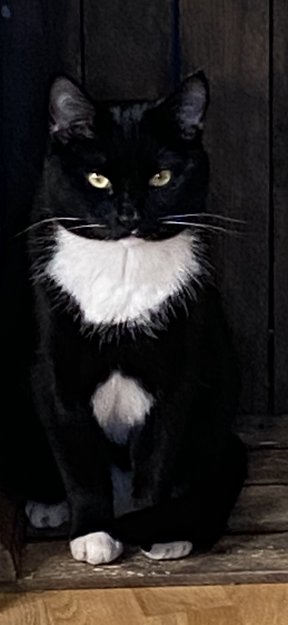 Klassisk sort og hvit huskatt, liten hvit prikk under snuta.
