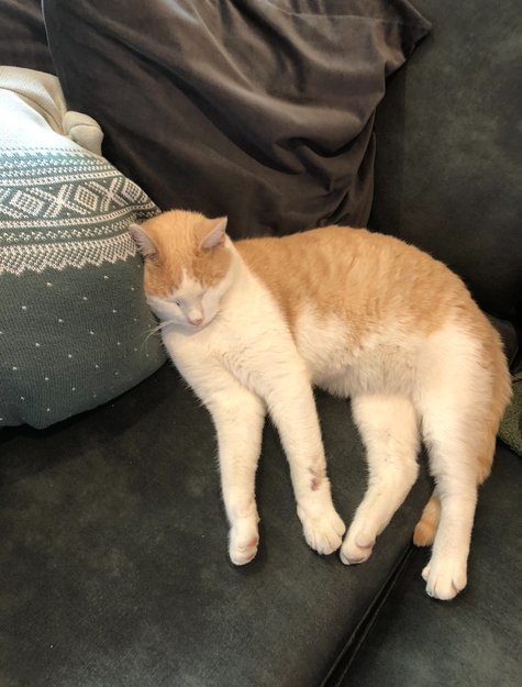 Oransje og hvit kastrert hannkatt. Ble operert i halen på tirsdag og rømte onsdag. Har skjerm rundt halsen og bandasjert hale. Var helt i tåka etter å ha vært i narkose og forferdelig trist at han klarte å komme seg ut.