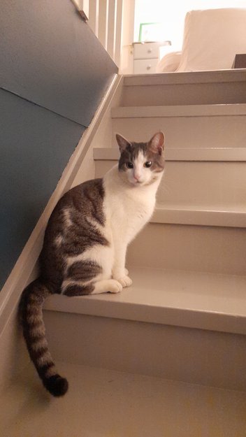 Han kan være litt redd for fremmede, og redd for bråk og høye lyder. Har lang stripete hale og et hjerteformet merke på høyre side. Kommer kanskje hvis du roper pus, pus og lager kysse/smattelyder.