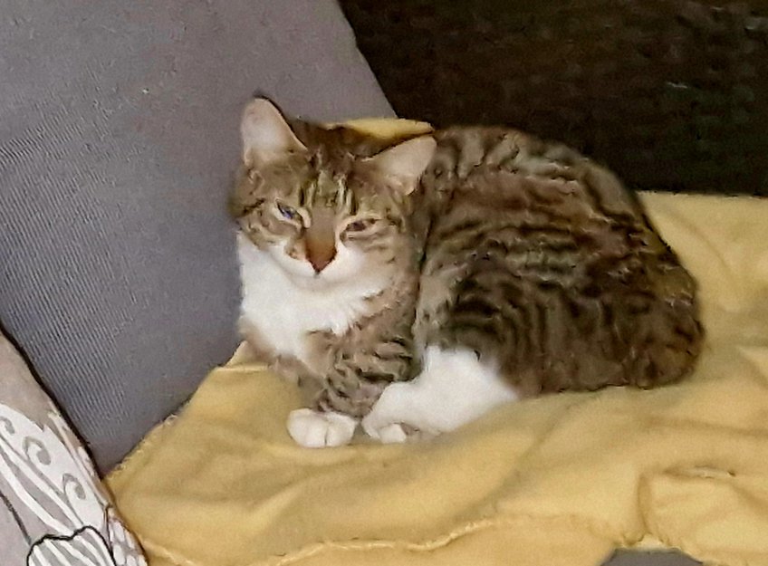 Som det fremgår av bildet er dette en trefarget katt; svart grå og hvit - og dermed trolig en hunnkatt. Hun er lita og nett, søt og snill og trygg. Tror ikke hun er mer enn max et par år, men vanskelig å si. Se bildet :)