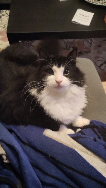 Han er stor. Mest svart, med hvite poter, hals, mage og et slags hvitt hjerte i ansiktet som starter over nesa. Flerfargede puter under potene.