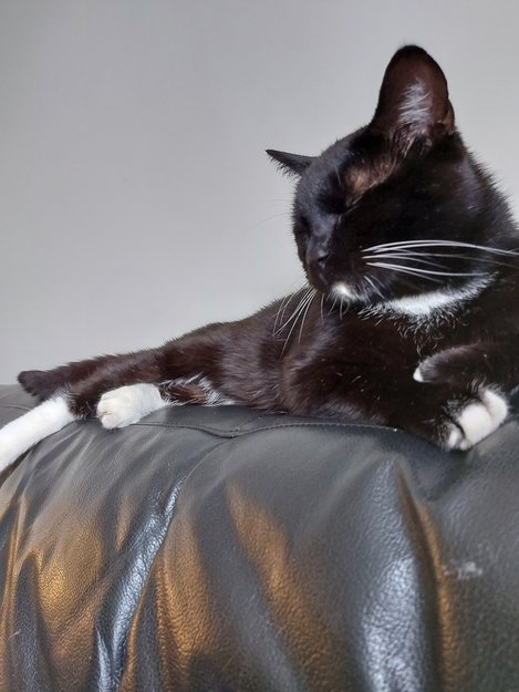 Korte følehorn over øyene fra slosskamp, svarte følehorn over høyre øye, lettskremt når den er ute, hvit pels på tuppen av de fremste potene, hvit pels på haken, tynt hvit på magen, tynn på kroppen.