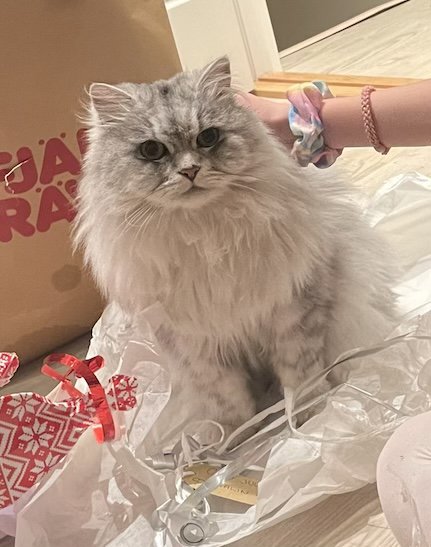 Hunnkatt med langhåret grå pels. Hvit pels på brystet. Blanding mellom chinchilla perser og skogskatt.