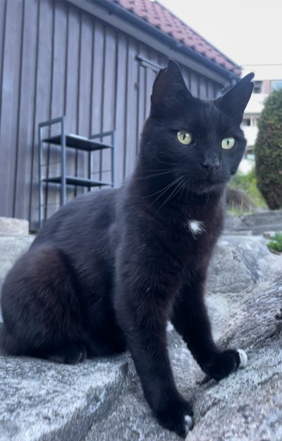 Hvit flekk på halsen og på begge frem potene. Hakk i begge ører. Han er øremerket.