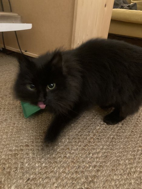 Veldig søt, liten, virker velstelt, aktiv og kosete. Helt sort fin pels. Kontaktsøkende, virker som den er vant til å få mye oppmerksomhet.