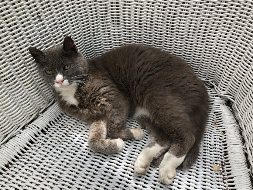 Katten er grå med hvite poter, hvit på bryst og mage