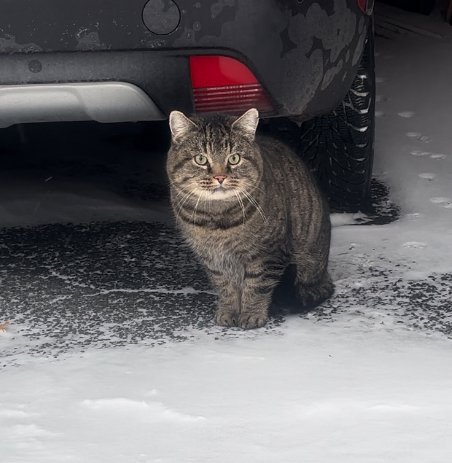 På grunn av den ekstreme kulden som er meldt har jeg lokket den inn, den gjemmer seg nå under sofaen. Håper å få den i et bur så vi kan sjekke chip.
