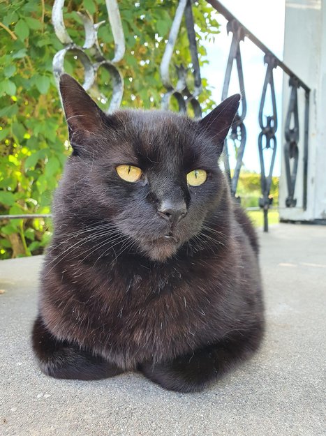 Helt svart. Ser litt mutt/sur ut. Dypt savnet 😿 Adoptert fra Miabua.
