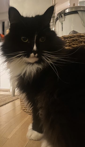 Sort langhåret pels, hvit stripe mellom øyne og på nese. Hvitt bryst, hvite poter