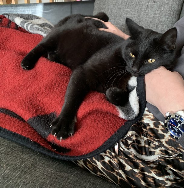 Olivia har en liten hvit/blek flekk på brystet. Gule øyne, voksen størrelse, slank, lang, korthåret.