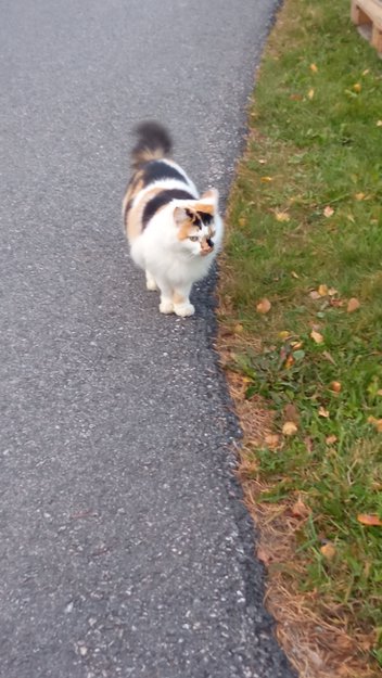 Hun har lang håret og tre farger: orange, hvit og svart.