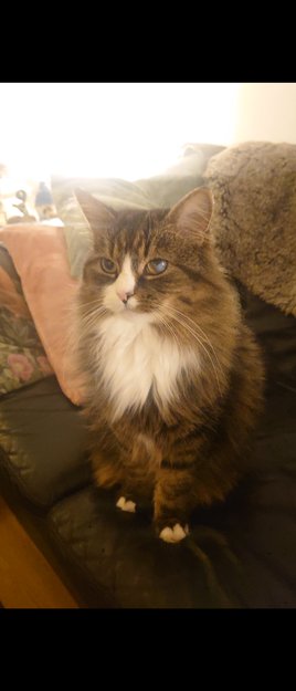 Arr på ene øyet etter tidligere skade. Også arr på ene øret etter mest sannsynlig slossing med annen katt.