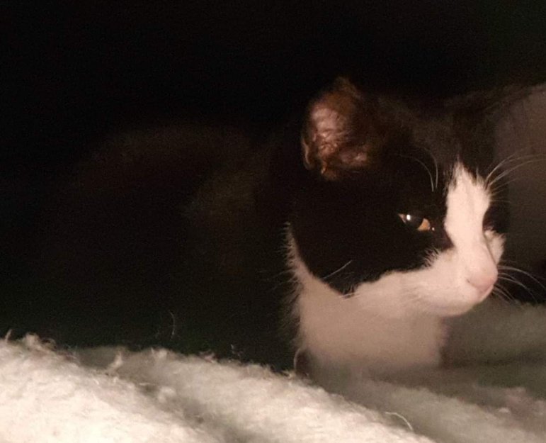 Middels stor hannkatt, som ses på bildet svart pels med hvite detaljer i ansikt og hals. Har et hakk på et av ørene.