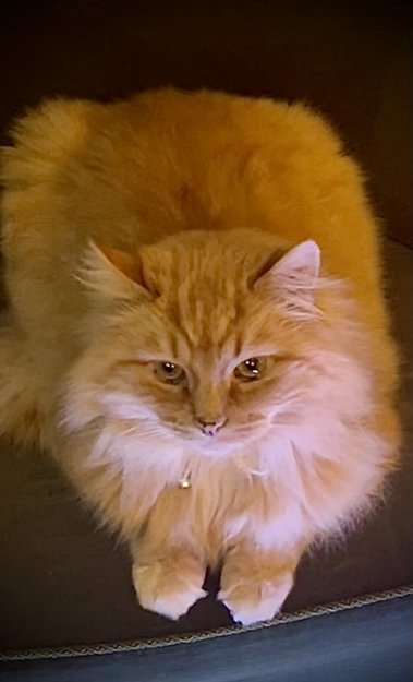 Theo har oransj lang pels. Har på seg mørkeblå traktive gps i halsen med bjelle.