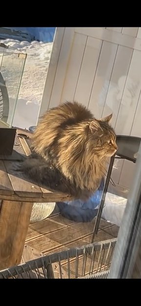 Katt står å mjauer utenfor huset vårt i kulda. Den har stått her siden i går formiddag og prøver å komme inn i varmen.
