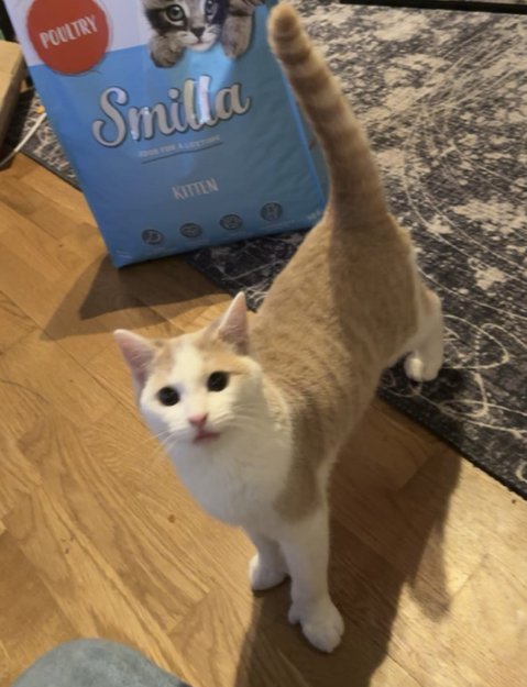 Liten gutt med oransje og hvit todelt pels. Han er en «skipskatt» så det ser ut som han har ekstra tommeltotter på labbene