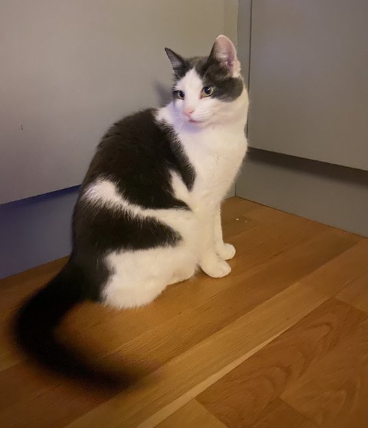 Grå og hvit korthåret katt. Hvit farge på munn og panne, og grå rundt øynene og hodet. Grå flekk på venstre bakbein, og grå hale.