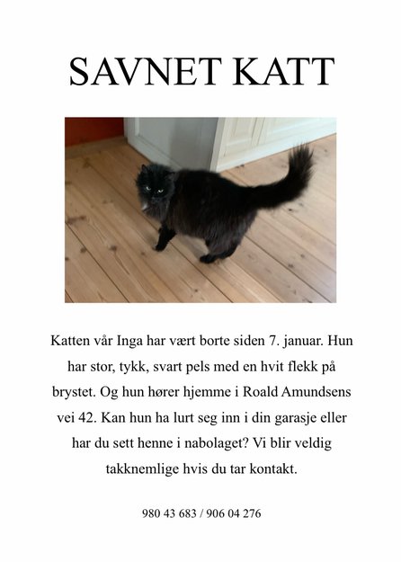 Inga løp ut i kulda søndag 6.1 kl 12 ca, og har ikke kommet tilbake. Hun har tjukk pels og er mye ute, men ikke lenge om gangen når det er så kaldt som nå. Hun er tillitsfull men litt forsiktig med fremmede.
