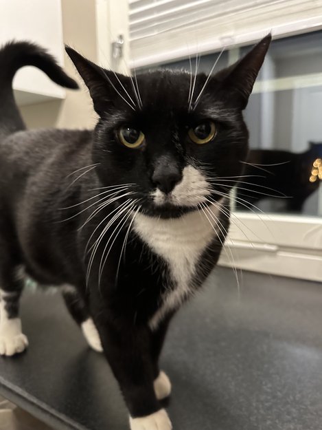 Lange værhår, har værhår på kinnene, har hvite poter med svarte poteputer. Katten har ikke noe form for halsbånd eller synlig merking på seg.