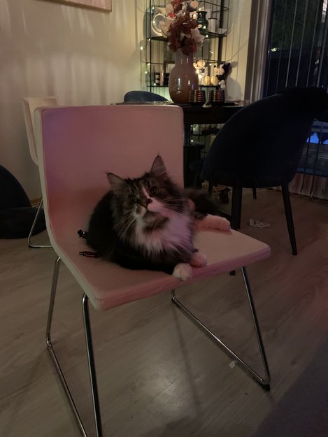 Han er veldig liten til å være delvis skogskatt generelt en liten katt, 4-5 kg. Litt engstelig og forsiktig men koser og leker når han er trygg. Veldig selvstendig.