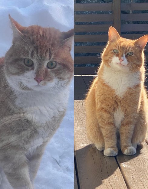 Det kan være han har har et hakk på det ene øret og være skadet. Han kan derfor se noe annerledes ut enn bildet vårt til høyre.