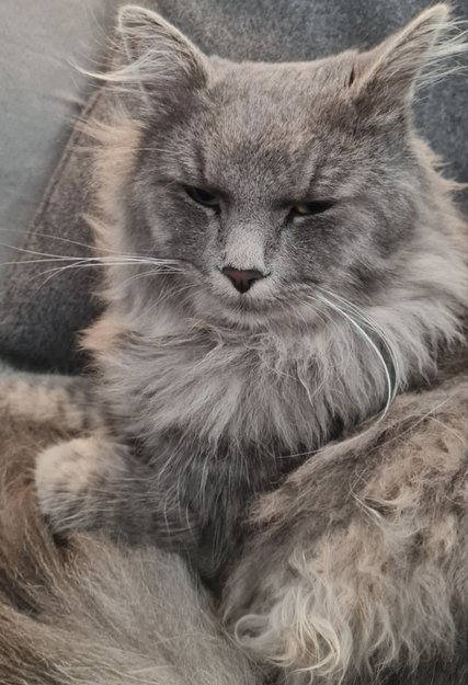 Han er langhåret med korte ben. Han er veldig tillitsfull og kosete.
