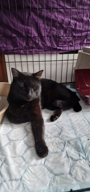 Helt sort pus, med noen få hvite hår på brystet. Stor og slank
