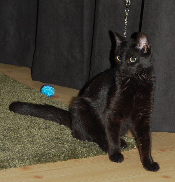 Liten og slank, helsort. Panter-aktig utseende. Den var ca 3-4 mnd gammel når vi fant den og altfor liten til å være ute på egen hånd. Gule øyne. Snill,men lettskremt og svært forsiktig enda. Trolig gått ute en stund og blitt lite håndtert av folk.