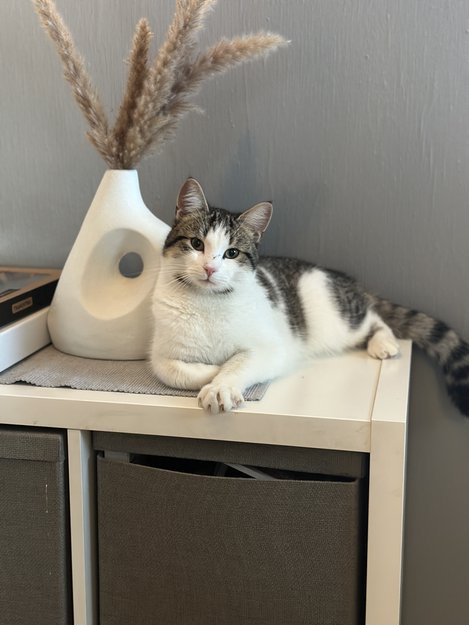 Hvit/grå/svart hannkatt ble funnet i Fredrikstad