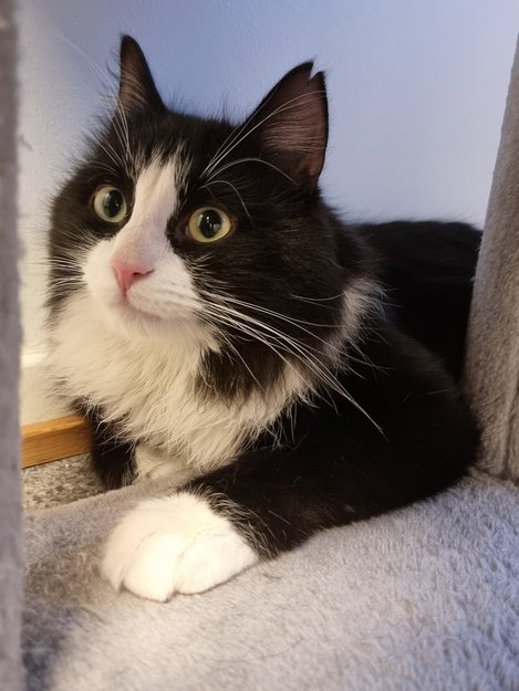 Kan være kastrert, men usikkert. Ingen ID chip. Har et hakk i venstre øre, stor tykk hale med mye pels. Trygg og tillitsfull. Blank og fin i pelsen.