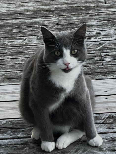 Den er grå og hvitt farge. Den er ett og et halvt år gammel. Utekatt og elsker å være ute. Nydelig ukastrert og ikke chippet hannkatt. Han er redd for fremmede folk. Men er flink til å komme etter vi roper til han på sitt navn «Leo». Den skjenner sitt navn veldig godt.