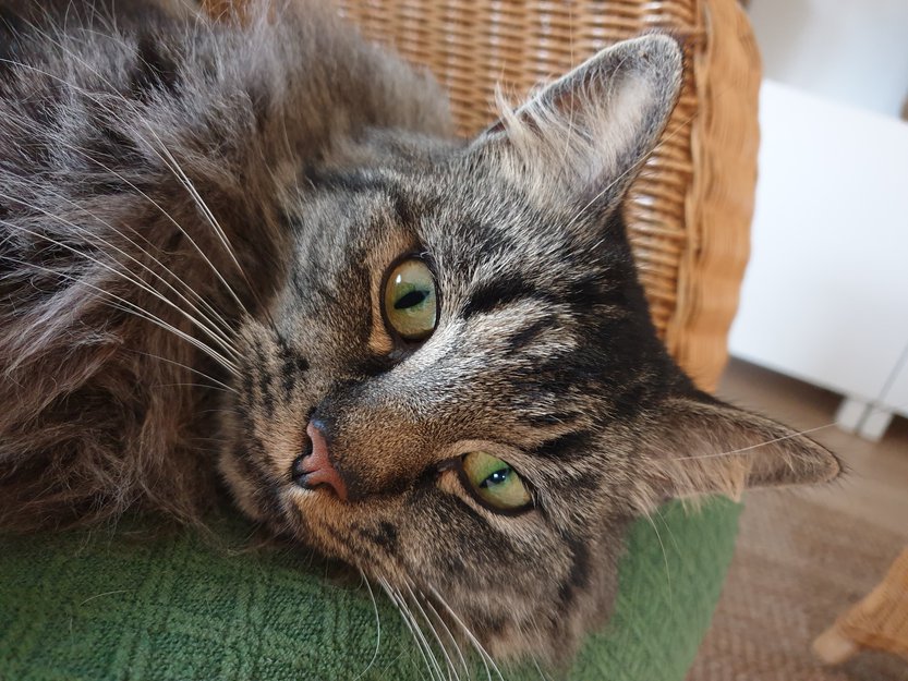 Kraftig buskete hale, rosa snute, grønne øyne, lange værhår, brun under, sort/mørk over rygg og hale. Litt sky og forsiktig.