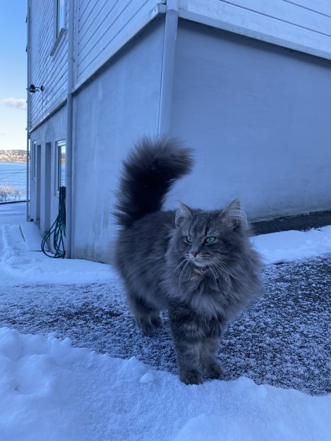 Jeg slapp klompen ut på natten også var han ikke tilbake igjen til morningen og det pleier han å være. Det har snødd mye og er kaldt. Jeg har gått rundt i hele nabolaget og ropt og skjekket bod og garasjen. Jeg er redd for hva som har skjedd eller om han sitter fast et sted.