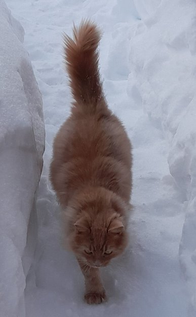 Han kom hit i romjula og har vært mye inne fordi det har vært så dårlig vær og mye snø. Har etterhvert tatt seg noen korte turer ut, men har vært kjapt tilbake. Det var én natt han ikke kom før morgenen etter. Har derfor håpet at han snart vil være her, men nå har det gått vel en uke og det er ingen tegn. Har ropt, men snømengdene og været ellers har gjort leting vanskelig. Håpet er at han har funnet et trygt sted og noen snille mennesker som passer på ham. Han er utrolig flink til å klare seg, men dette været har vært vanskelig selv for den tøffeste pus!