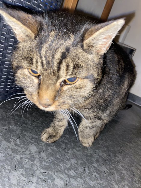 Min mor fant katten i Sørmarka, rett ved hundeparken. Katten var mager og så veldig sliten ut. Den klarer ikke å gå skikkelig med bakbeina og har et sår på poten. Den har heller ikke noe chip. Det ser ut som katten har vært ute en stund uten mat. Vi har tatt katten inn til oss og gir den både mat og vann. Vi fikk beksjed av dyrlegen om å vente med å gjøre noe mer undersøkelser osv. med katten til vi vet om den har eiere eller ikke.