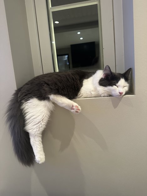 Langhåret, hvit/grå bicolor. Grå over rygg, ører og panne. Det grå går ned inntil ytterkanten av høyre øye. Mjauer sjeldent og har generelt lav stemme. Trygg på mennesker.