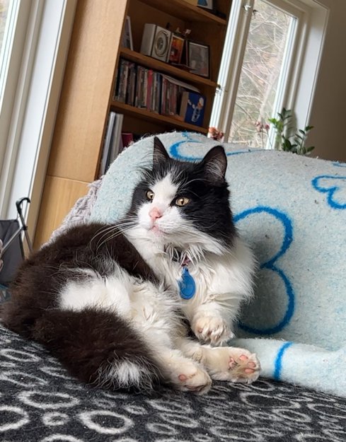 Har halsbånd på seg. Blå navnetagg og lilla halsbånd. Han har en skader frem pote. Der er fra hans yngre dager som kamp herre. Men den er ikke vond idag.