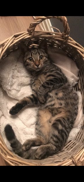 Liten gråspraglete katt. Sosial og nysgjerrig