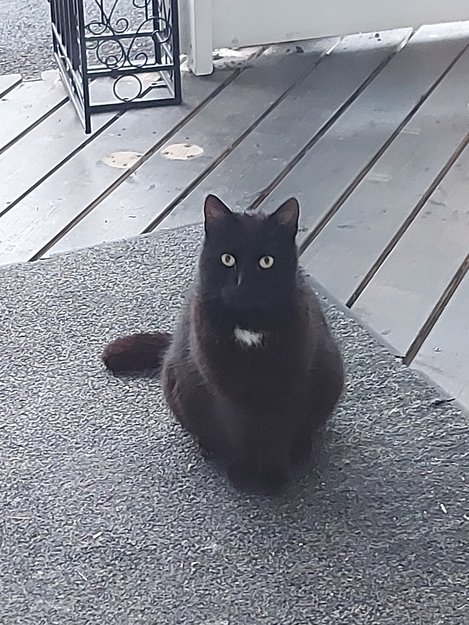 Går en svart katt med litt hvitt på brøstet i nabolaget. Den har gått her lenge og har nå begynt å miste pels bak på ryggen.