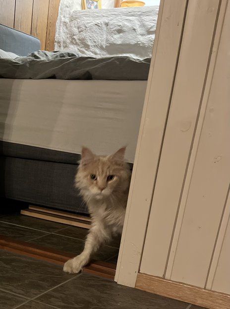 Apollo er ID-chipet, men jeg har ikke nummeret. Apollo er en stor Maine Coon hankatt, kastrert. Han er veldig sky og kommer kun når broren min roper på han. Jeg vil veldig gjerne ta vare på Apollo videre.