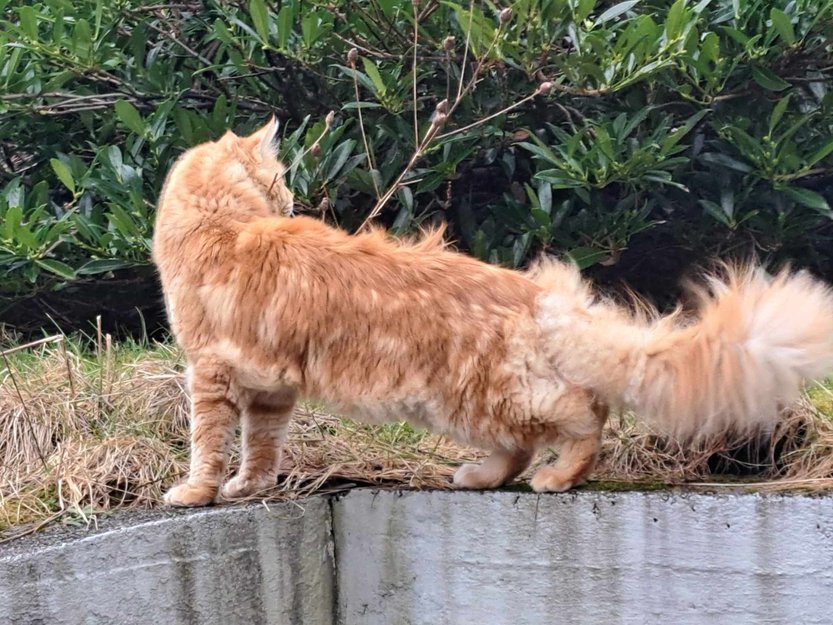 Katten er av rasen Maine Coon og Ca 1år ... 90cm lang ifra nesetipp til haletupp. Semilanghåret Redtabby. Halen er lang og tykk. Den har ikke fått særlig krage.