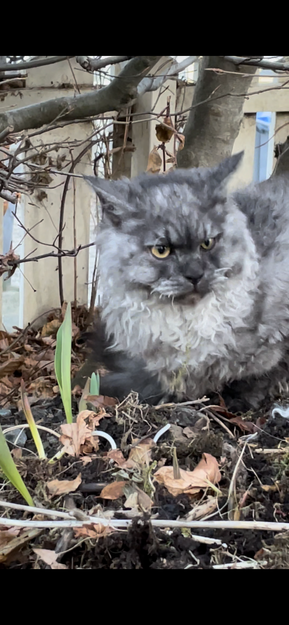Gråsvart langhåret katt har hengt mye i hagen vår siste dagene. Ser ut som en ung katt. Mulig gutt Ca 9 mnd. Lett krøller i pelsen.