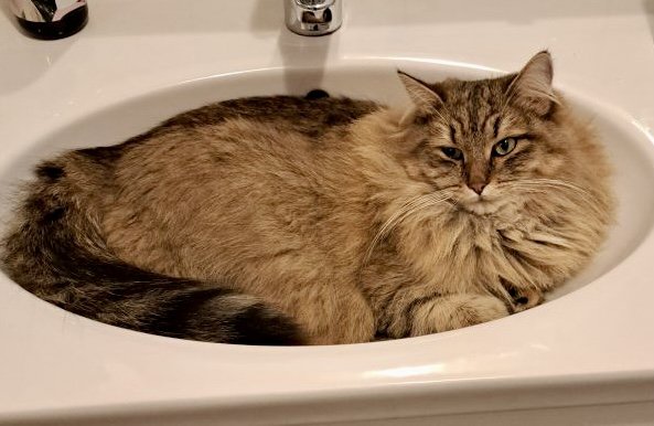 Nokså liten, langhåret katt med mye spraglete pels i brun- og gråtoner. En god «løvemanke» nå på vinteren. Halen henger ofte litt ned eller til siden. Er litt forsiktig, men kontaktsøkende om hun er trygg.