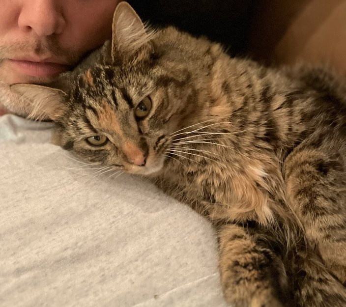 Ca 2 år. Brun flekk mellom ørene, og tendens til brun stripe ned mot snuten. Fluffy hale. (Mor er langhåret)
