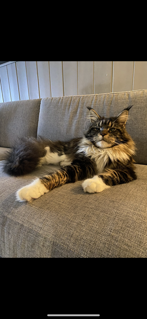 Typiske maine coon trekk fantastisk nesten litt lemur hale. Store ører. Sort flekk på høyre bakfot
