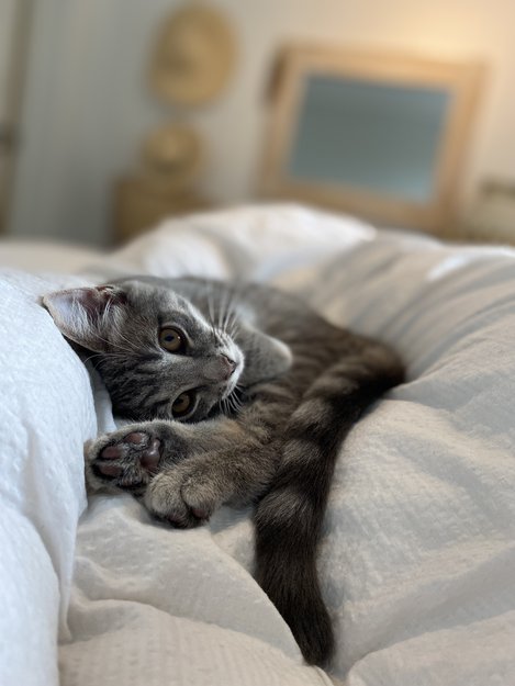 Stripete, grå, hvit kant rundt øynene. Ca 10 mnd.